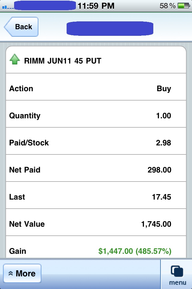 Was away on a short holiday trip but that didn’t stop me (or you) from selling or buying the stocks or options, as long as you’re connected to the internet. Can you imagine the trading or investing landscape changes between now and ten years ago? Now, as long as you’ve a smartphone with connectivity to the internet, you can basically do anything. As blogged earlier, I took profit on Research In Motion Limited’s (Nasdaq: RIMM, stock) while holidaying and what was particularly sweet was the percentage of profit – 480% – something which I had not tasted for many moons.